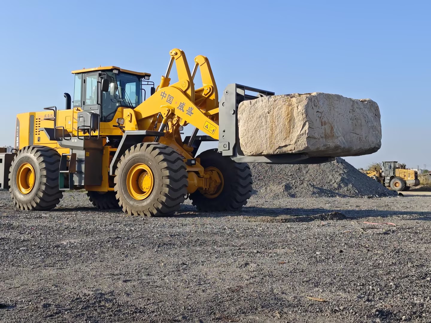 以备受市场认可的WSM951T16型为例,这台装载机叉车拥有令人惊叹的双重性格。当它需要叉举重型石材荒料时,它是专业的“起重专家”——额定起重量高达17吨以上,配合复合式侧移调距叉,操作手无需下车即可微调货叉,精准插入物料底部。而当它需要铲运散料时,它又是力大无穷的“开路先锋”——Z型六连杆工作机构赋予其强大的掘起力,标准铲斗可以轻松应对砂石、煤炭、矿石的铲装需求。