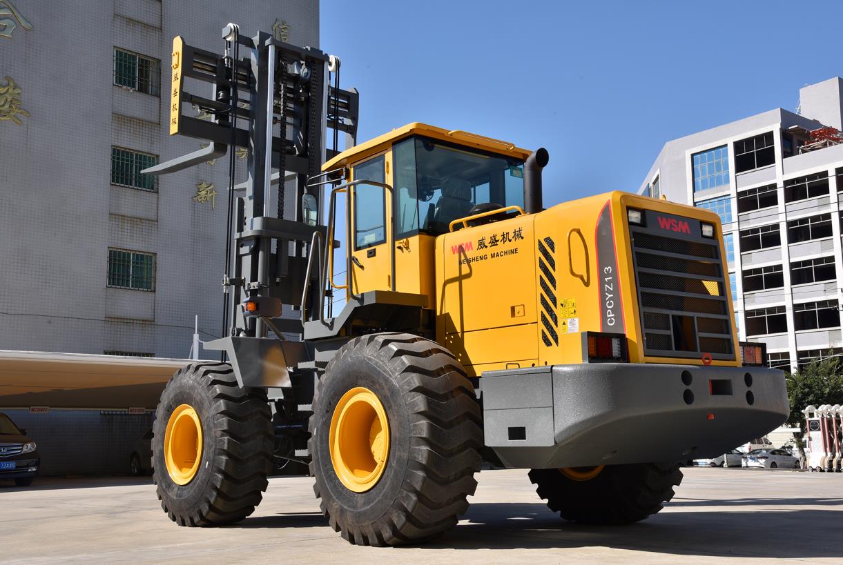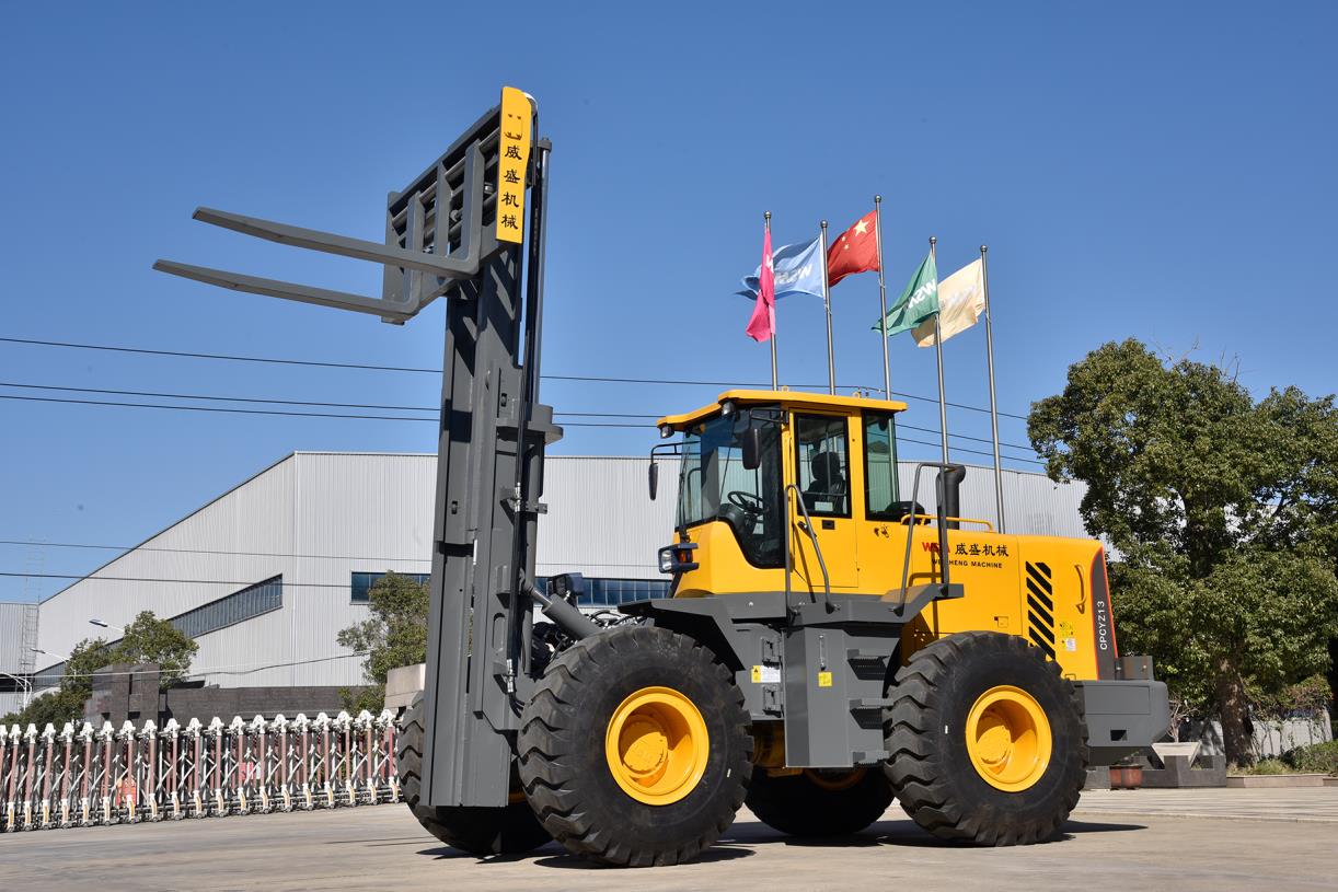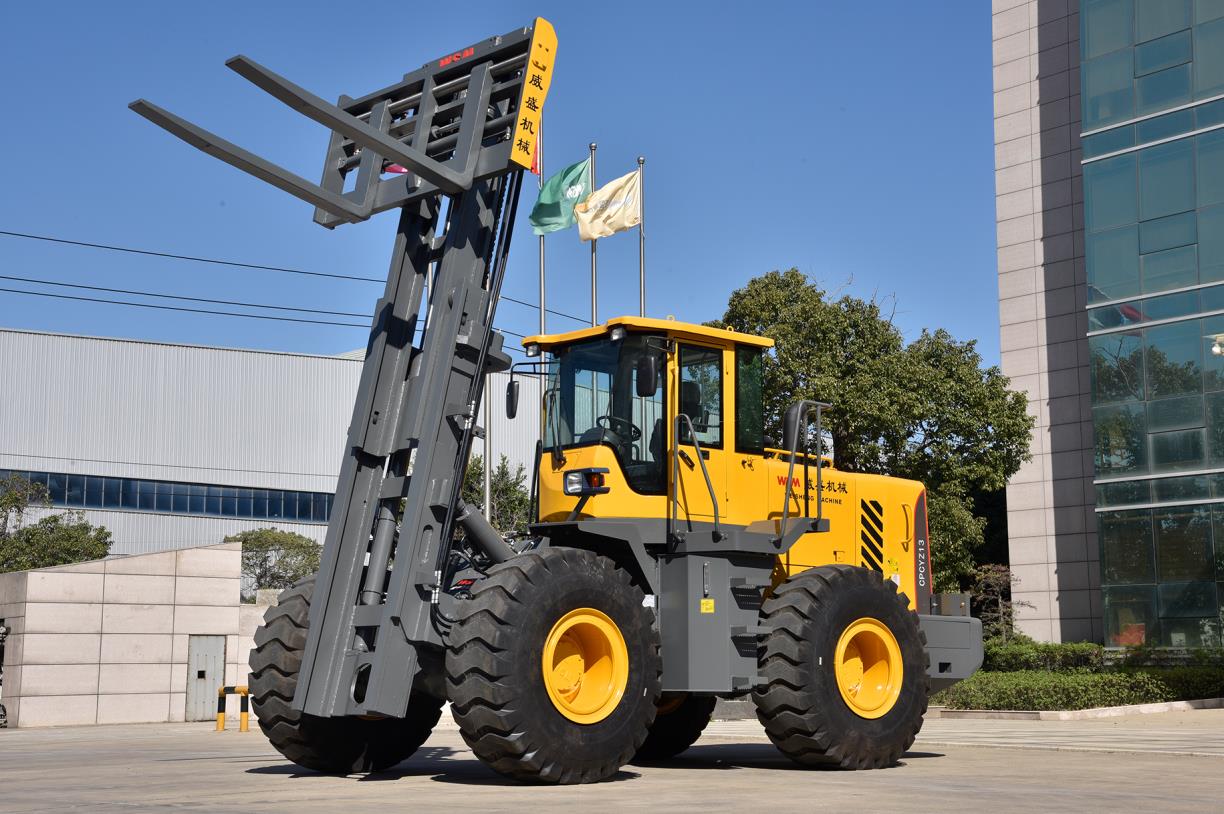 轮式越野叉车是具有双桥驱动及越野性能的内燃平衡重式液力传动叉车。该车具有良好的牵引性能和行驶性能;整车外形美观,操纵简便、舒适,效率高;工作平衡可靠,机动性强,维修方便。它适用于仓库、货场、车站、港口、矿山、工地及一般厂矿企业的货物装卸、堆垛或搬运,还可配装各种专用属具,以适应不同的装卸需要。